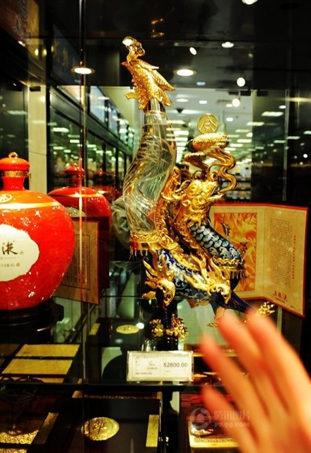 青岛某商场内,工作人员试图阻止记者拍摄一瓶标价52800元的高档白酒(2月20日摄)。据资料显示,目前我国城市生活垃圾里有超过三分之一是包装性垃圾,包装废弃物体积占固体废弃物的50%,每年废弃价值达4000亿元。