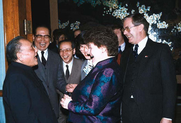 傅莹曾担任邓小平的随行翻译。图为1988年1月20日,84岁的邓小平在接见48岁的挪威首相布伦特兰夫人时,傅莹将邓小平的84岁错译为48岁,当副外长周南把这一情形告诉邓小平时,邓小平没有批评傅莹,反而开怀大笑。