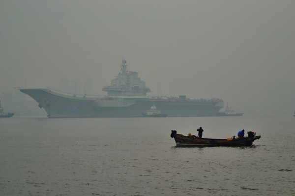 2月26日9点半左右,大连港口大雾弥漫,中国首艘航母“辽宁舰”离开港口。据悉,这次航母将要去往青岛胶东航母基地。图为“辽宁舰”离开港口。