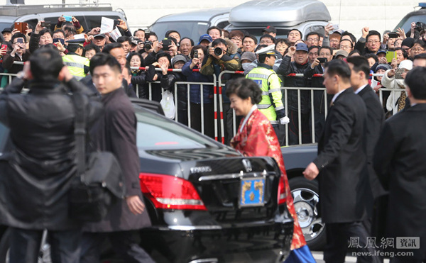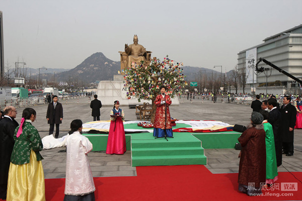 当地时间2013年2月25日,韩国首尔,韩国新任总统朴槿惠在就职典礼结束后身着韩服出席许愿树幸运袋“开包”仪式。