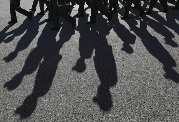 服刑人员在排队前往教室的路上。