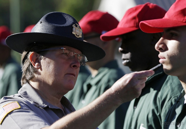 监察员检查犯人的胡须。